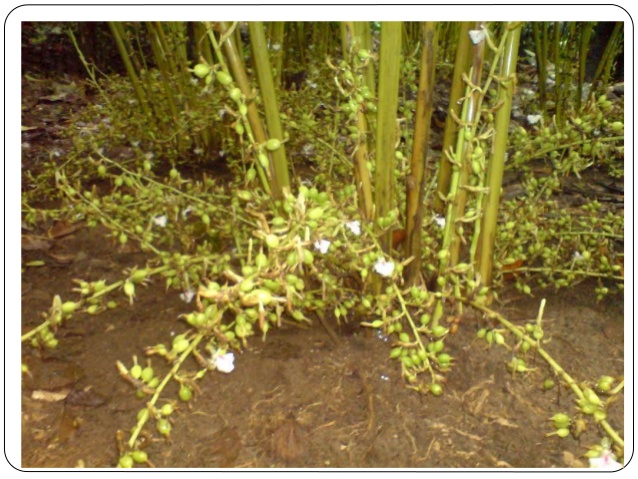 میوه ها کپسول سه خانه ای، بیضی شکل و به رنگ زرد یا سبز روشن است. طول میوه تازه متفاوت است و به رقم و شرایط اقلیمی محل رویش بستگی داشته و بین 1 تا 5 سانتیمتر است.