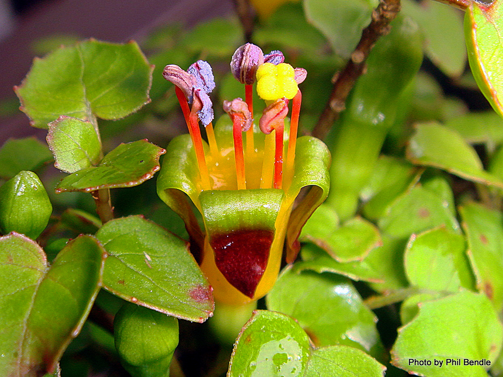 Fuchsia procumbens creeping fuchsia که به فارسی فوچیا خمیده نامیده میشود، گیاهی از خانواده onagraceae، بومی مناطق ساحلی جزیره شمالی نیوزلند می باشد. نیاز های این گیاه عبارتند از نور: زیاد رطوبت: مرطوب دمای محیط: 20 - 30 درجه سانتیگراد خاک: یک ترکیب غنی و با زهکش خوب