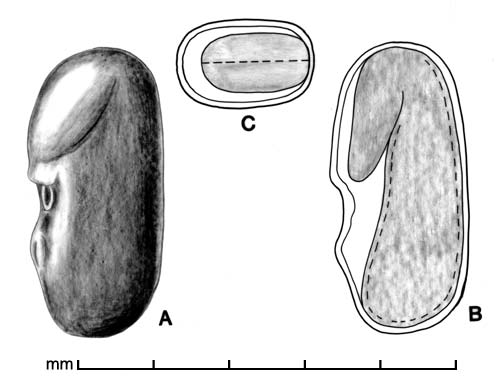 میوه گالگا غلاف دارد و طول آن 2 تا 4 سانتیمتر و ضخامت آن 2 تا 3 میلیمتر است. داخل میوه تعدادی دانه به رنگ قهوه ای روشن وجود دارد. طول دانه 4 تا 4.8 میلیمتر و ضخامت آن 1 تا 1.5 میلیمتر است. دانه بسیار محکم است و در طول آن یک شیار کم و بیش عمیق وجود دارد.