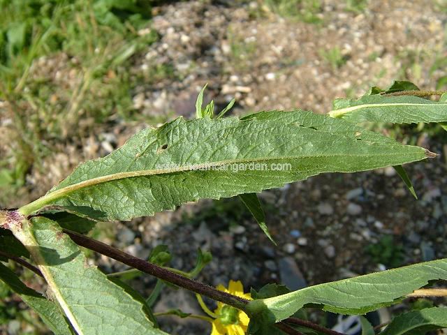 برگها ساده و درشتاند و بیشتر بهصورت متقابل در بخشهای پایین و با نزدیک شدن به انتهای ساقه گاهی متراکمتر دیده میشوند. پهنک برگ معمولاً بیضوی تا نیزهای با نوک تیز است و لبهها میتواند صاف تا دندانهدار باشد. سطح برگ غالباً زبر و کمی کرکدار، و رنگ آن سبز تیره است؛ طول برگها اغلب در محدوده ۵ تا ۱۵ سانتیمتر قرار میگیرد.