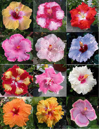 حالت و اندازه گل ها بسیار متنوع می باشد حداقل اندازه ۲ سانتیمتر و حداکثر اندازه ثبت شده بیشتر از ۲۴ سانتیمتر می باشد .البته واریته هایی که در ایران در بازار موجود می باشد هرگز تا این اندازه گل تولید نمی کنند و رنگ های ساده تری هم دارند چون این واریته ها از زمانهای بسیار قبل وارد کشور شده اند و تلاشی هم در پرورش هیبرید های جدید به عمل نیامده است ولی هم اکنون بیش از ۱۰ هزار واریته در بانک اطلاعات انجمن هیبیسکوس ثبت شده است که هر روز هم به تعداد انها اضافه می شود
