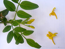 برگها اغلب مرکبِ شانهای و شامل چند برگچهٔ بیضوی تا نیزهای هستند؛ لبهٔ برگچهها معمولاً صاف و نوک آنها اندکی تیز است. سطح برگ سبزِ تیره و نسبتاً براق بوده و بافت آن از نازک تا نیمهچرمی متغیر است. برگها روی ساقه به صورت متقابل قرار میگیرند و دمبرگ و محور برگ مرکب، ظریف و انعطافپذیر است.