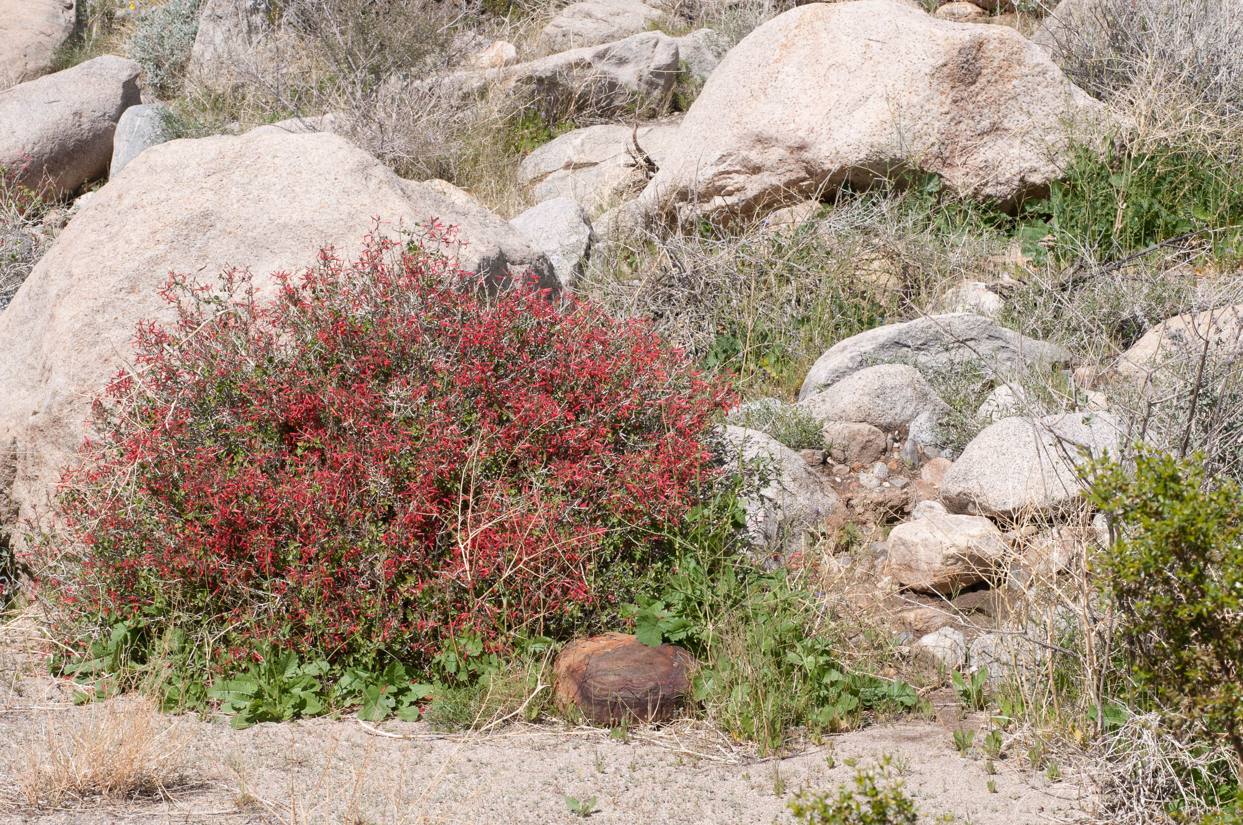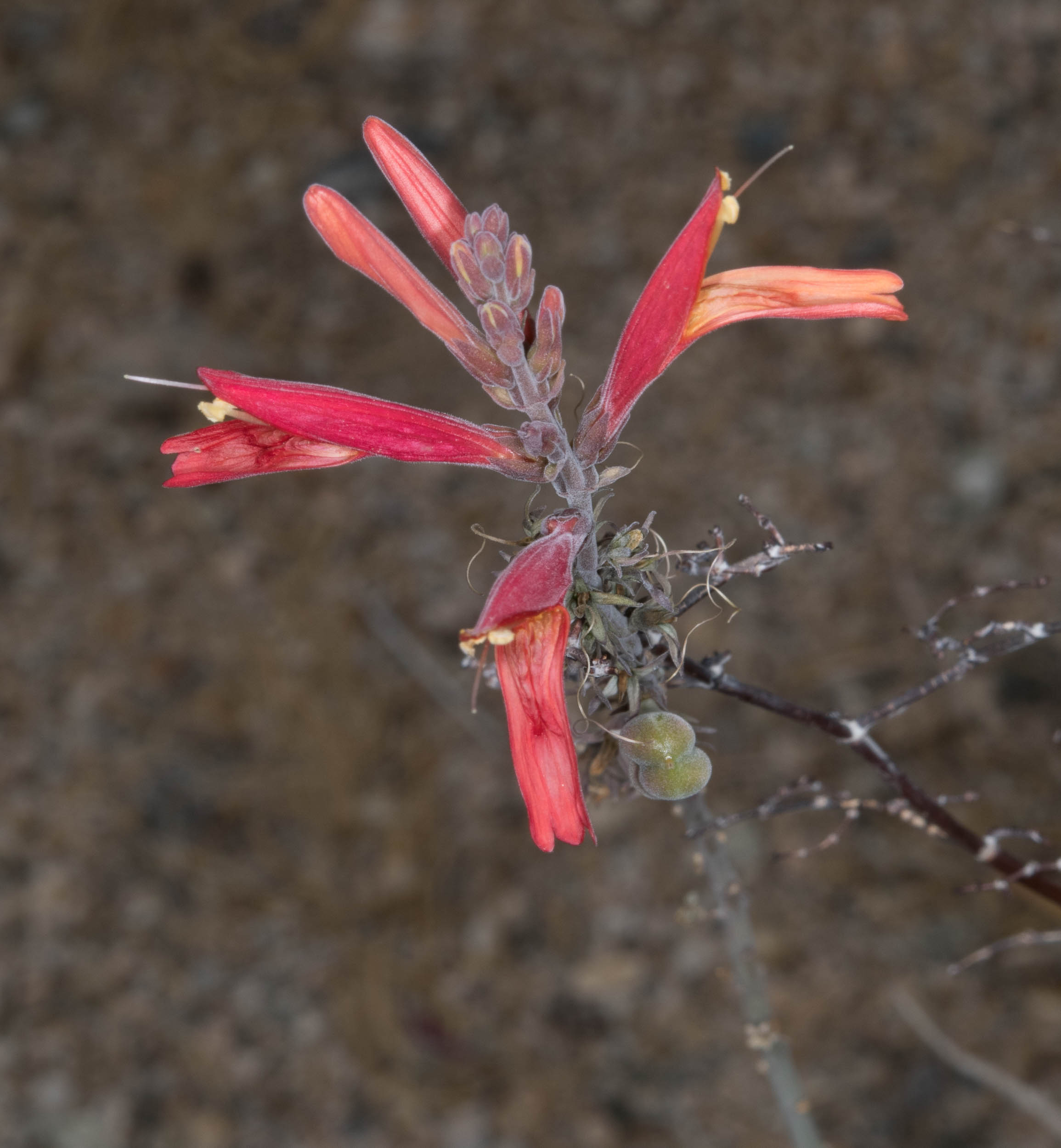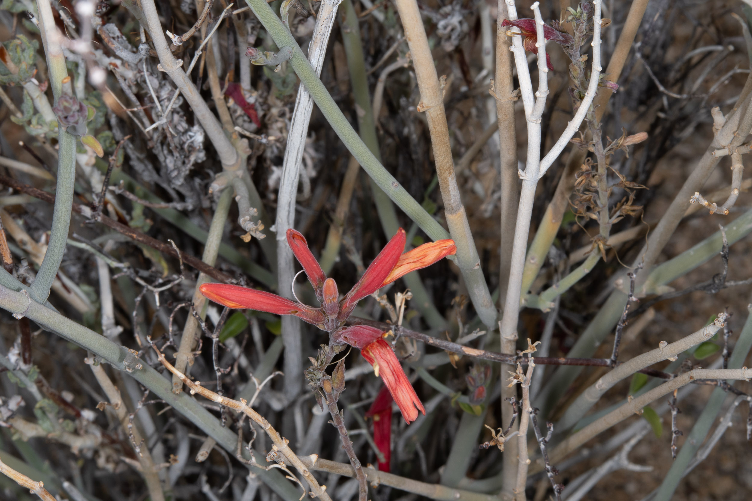 Justicia californica معمولاً در دامنههای سنگلاخی، بستر آبراهههای خشکشونده، حاشیه درههای خشک و خاکهای شنی یا ریگی رشد میکند. ریشههای عمیق و سیستم ریشهای گسترده به آن اجازه میدهد از منابع محدود آب بهرهبرداری کند. گلهای لولهای قرمز آن منبع شهد زمستانه و بهاره برای مرغ مگسخوارها و برخی حشرات گردهافشان است و نقش مهمی در شبکههای گردهافشانی بیابانی دارد.