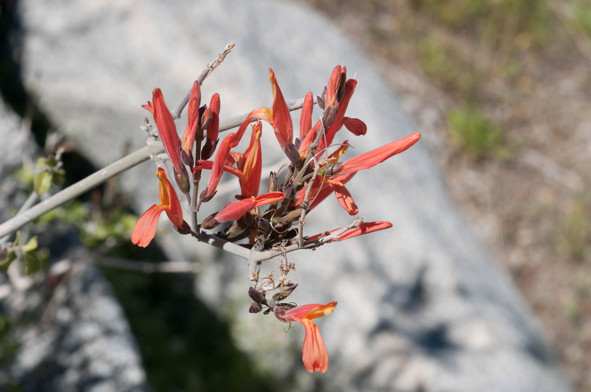 گلها لولهای، دراز و باریک با طول حدود ۲ تا ۴ سانتیمتر هستند و به صورت خوشههای کوتاه در انتهای شاخهها یا از زاویه برگها ظاهر میشوند. رنگ گلها از قرمز روشن تا قرمز-نارنجی متغیر است و درون لوله گل معمولاً سایههای تیرهتر دیده میشود. کاسه گل کوچک، سبز و کماهمیت است اما جام گل باریک و کشیده، بسیار جلبتوجهکننده است. نوک گل کمی باز شده و دو لَب ظریف ایجاد میکند که محل خروج پرچمهاست. آرایش گلها روی شاخههای بدون برگ پایانی، جلوهای خطی و آتشین به گیاه میبخشد.