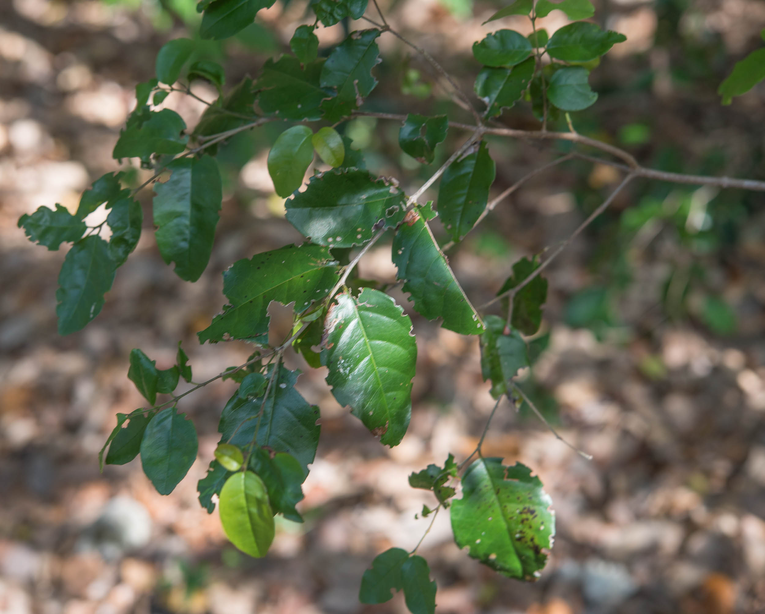 برگها ساده، کامل و همیشهسبز هستند و به صورت متناوب روی شاخه قرار میگیرند. شکل برگها بیضوی تا تخممرغی با انتهای گرد تا کمی نوکتیز است. طول برگها معمولاً ۲ تا ۵ سانتیمتر و عرض آنها ۱ تا ۳ سانتیمتر است. رنگ سطح رویی برگها سبز تیره و براق و سطح زیرین سبز روشنتر و مات است. دمبرگ کوتاه و رگبرگ میانی برجسته اما ظریف است و حاشیه برگ کاملاً صاف و بدون دندانه است.