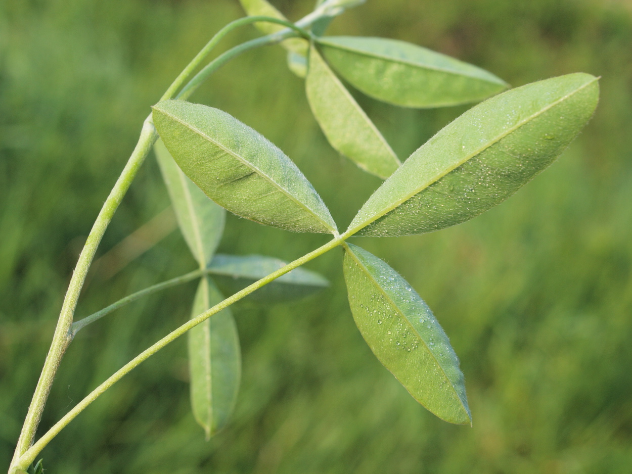 برگ‌ها متناوب، 3 برگچه‌ای، دمبرگدار، برگچه‌ها بيضوی تا بيضوی مستطيلی يا بيضوی- واژتخم‌مرغی، به طول 8-3 سانتی‌متر. هنگام جوانی در سطح تحتانی سبز مايل به خاكستری، كركدار، دمبرگ‌ها به طول 6-2 سانتی‌متر هستند.