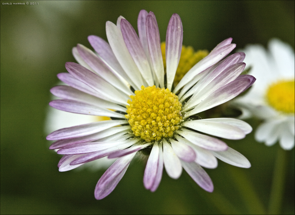 سر کوچک این گل که بیش از 5 سانتیمتر نمیباشد ، شامل 20 گلچه سفید میباشد که یک قرص زرد را در بر گرفته .