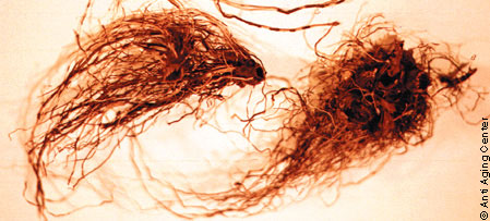 ریشه دارای ریزومی به ضخامت 0.5 تا 3 سانتیمتر است. از ریزوم انشعاب های فراوانی به رنگ سیاه یا قهوه ای تیره که ضخامت آنها 5 تا 6 میلیمتر است، منشعب می شود. این انشعاب ها نرم و انعطاف پذیر و تا حدودی ارتجاعی هستند. در سال اول رویش، فقط برگ های طوقه ای تشکیل می شوند. از سال دوم، از قسمت فوقانی ریشه تعداد 2 تا 12 ساقه خارج می شود. ساقه ها پوشیده از کرک های تار عنکبوتی شکل هستند. برگ ها طویل، نیزه ای شکل و دارای بریدگی های کم و بیش عمیق هستند و به تدریج به طرف نوک باریک می شوند. در قسمت فوقانی ساقه، نسبت به قسمت های دیگر از طول برگ ها کاسته می شود.