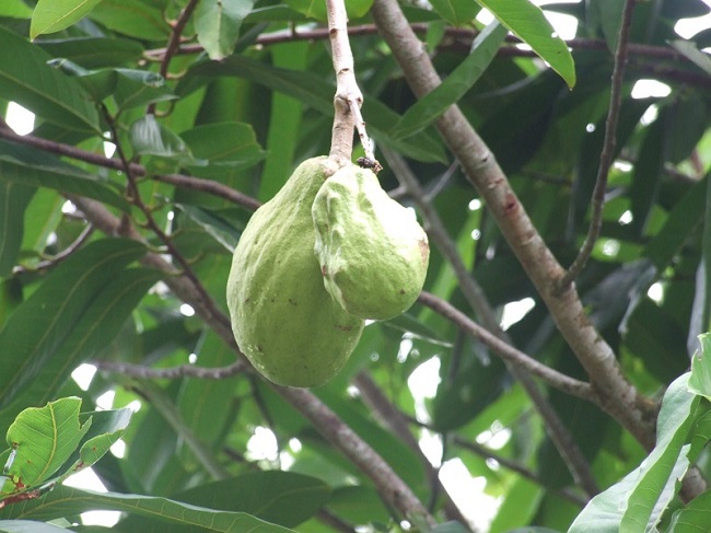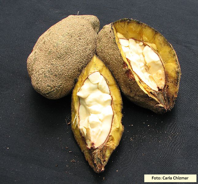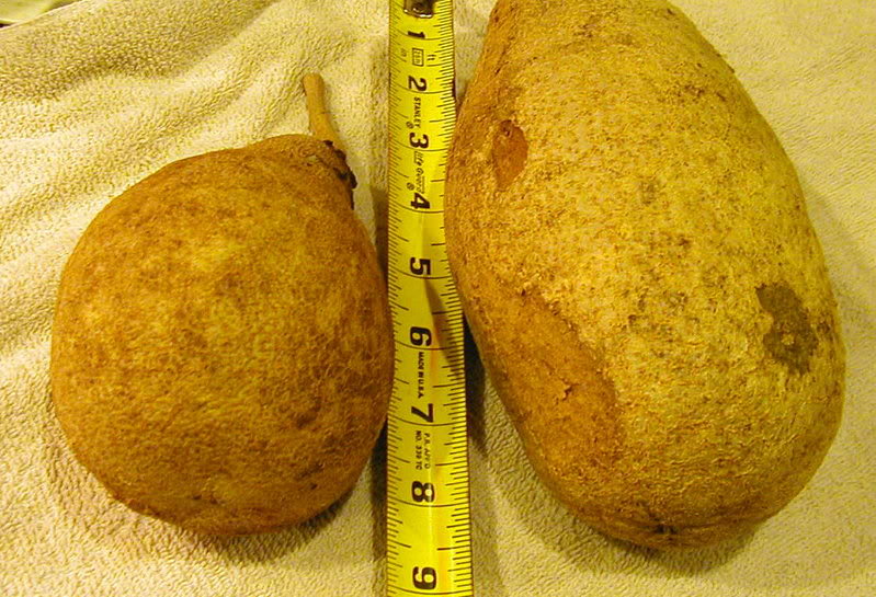 میوه ها واژتخم مرغی یا گلابی شکل بوده و 12 تا 20 سانتیمتر طول و حدود 10 تا 14 سانتیمتر پهنا دارند. پوست میوه نازک، به رنگ قهوه ای تیره یا مایل به قرمز و دارای نقاط و عدسک های سفید رنگ هستند.