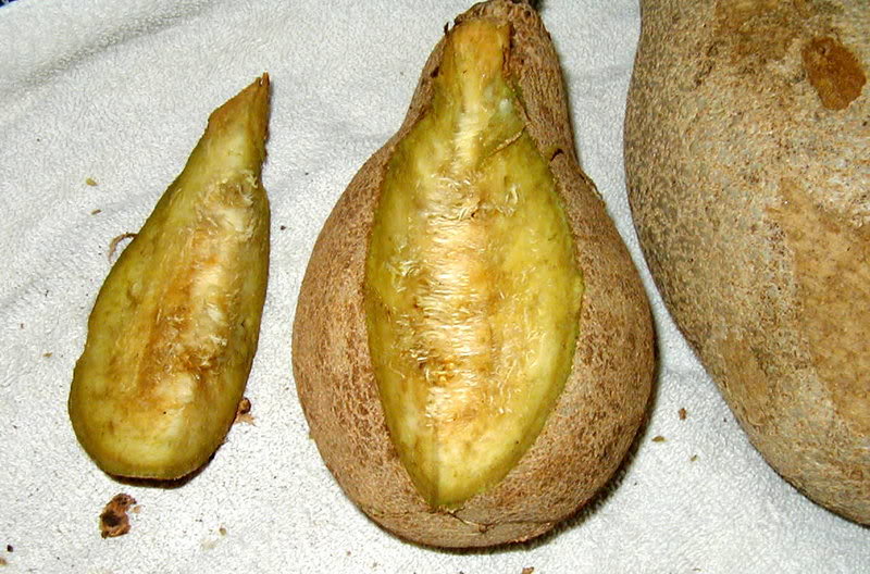 گوشت میوه گاهی مزه کدو تنبل را می دهد و به رنگ زرد یا زرد مایل به نارنجی نیز می باشد. گوشت میوه نرم، فیبردار، خشک یا آبدار و ترش و شیرین یا شیرین می باشد. معمولاً در هر میوه یک بذر گِرد یا تخم مرغی کشیده و پهن وجود دارد. این بذرها حدود 60 تا 10 سانتیمتر نیز طول دارند.