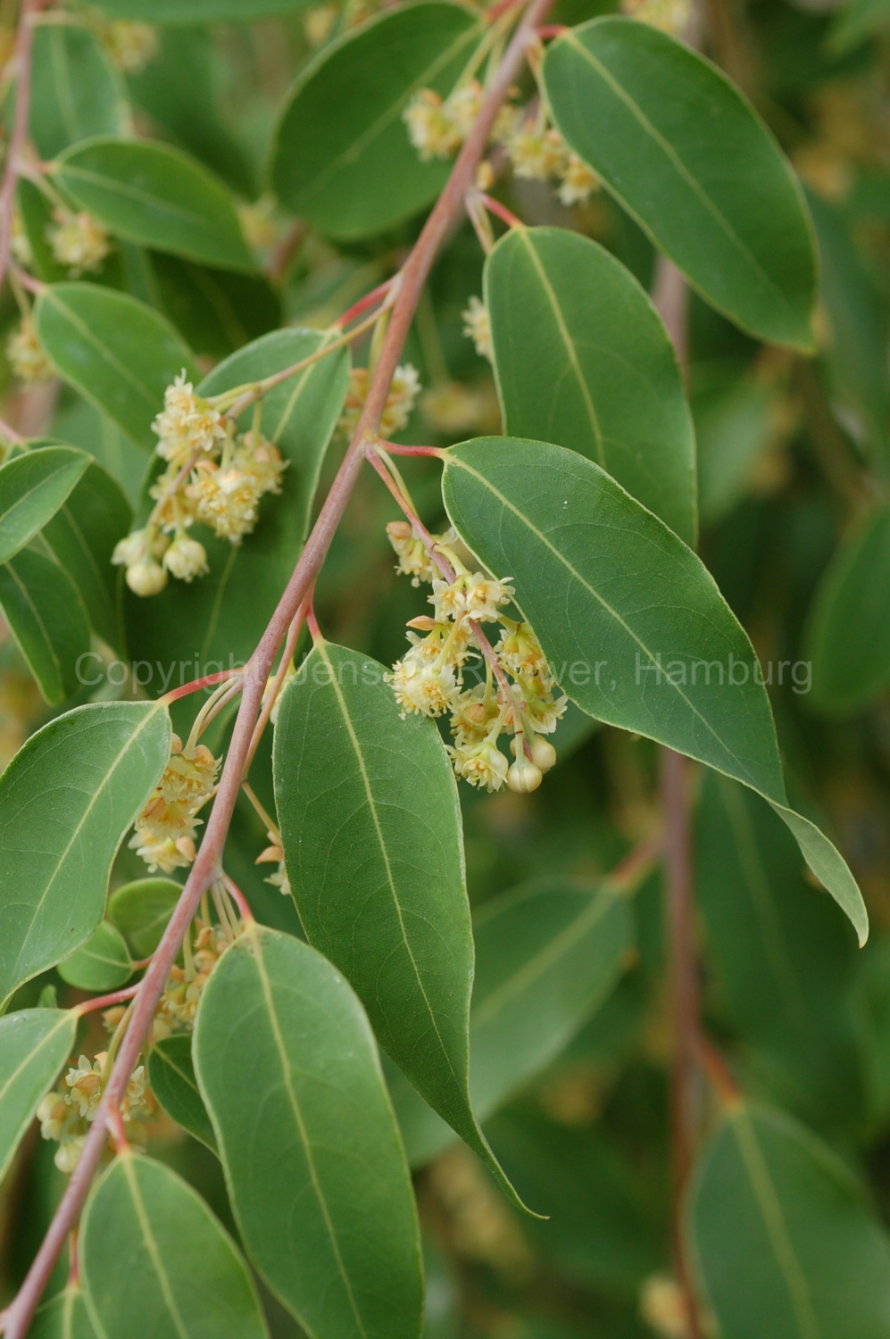 برگ ها باریک و طویل بوده و سطح بالایی آنها به رنگ سبز پررنگ و سطح زیرین به رنگ سبز روشن می باشند. این برگ ها متناوب، دارای دمبرگی به طول 6 تا 11 میلیمتر، بدون کرک، به طول 5 تا 9 سانتیمتر و عرض 2 تا 3 سانتیمتر، کشیده و نوک تیز، چرم مانند یا کاغذی می باشند.