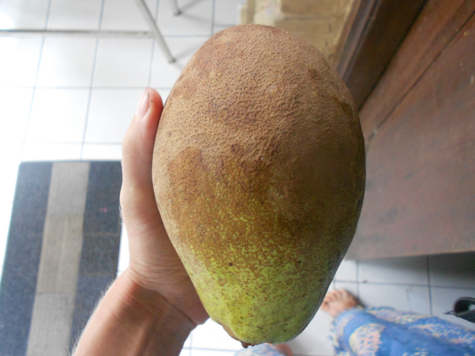 میوه ها بزرگ، خوراکی، بیضی شکل، شفت به طول 10 تا 15 سانتیمتر و عرض 6 تا 8 سانتیمتر هستند. پوست این میوه ها نازک، به رنگ قهوه ای با وصله هایی تیره تر می باشد. گوشت میوه ها نیز به رنگ سفید مایل به زرد، خمیرمانند و دارای عطری قوی با مزه و طعمی ترش و شیرین و مابین انبه و آناناس است.