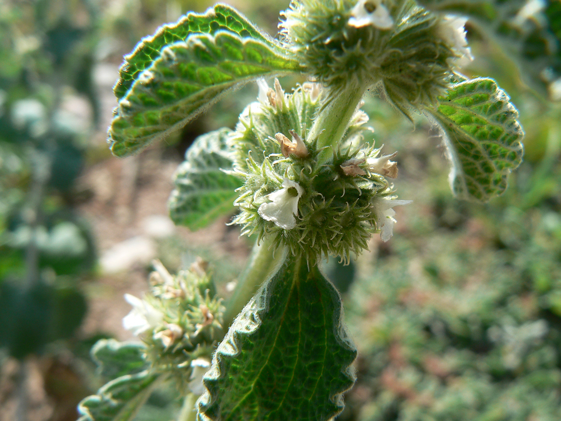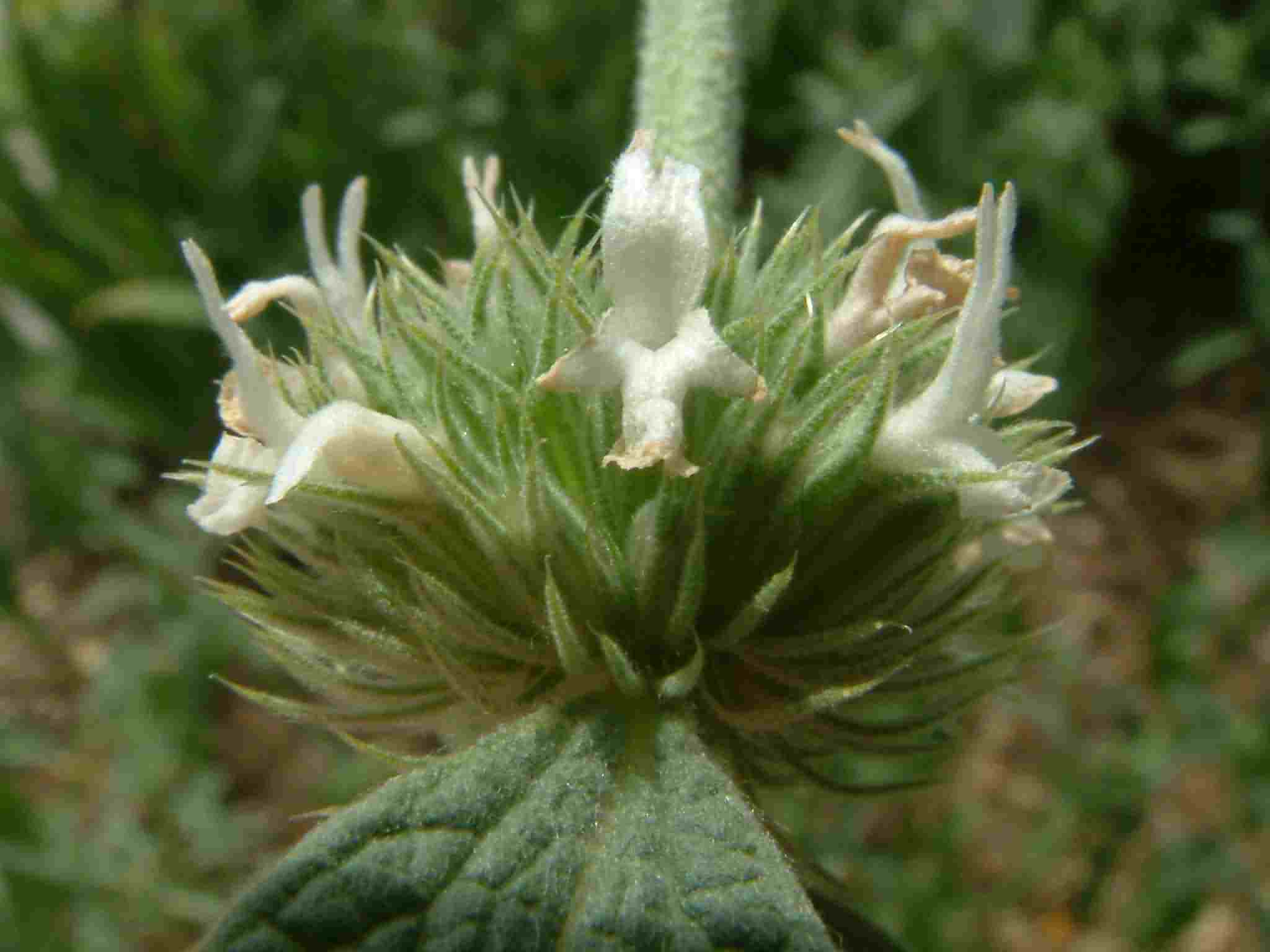 برگ های متقابل، ساده و بیضوی دارد که کرکهای فشرده ای آن را پوشانده اند. برگهای بالایی ساقه کوچک و برگهای پایینی ساقه بلندی دارند. گل های آن که به وضع مجتمع در کنار برگ های قسمت انتهایی ساقه ظاهر می شود، سفید پر رنگ است. دوره گلدهی از ژوئن تا آگوست است. بذرها کوچک و درخشان بوده و خارهای کوچکی دارند که به پراکنده شدن آن کمک می کند. تکثیر این گیاه توسط بذر است. ارتفاع بوته آن به 45-25 سانتی متر می رسد. ساقه این گیاه مقطعی دایره ای دارد و در پایین بوته کمی چوبی می شود. ساقه راست، منشعب، پوشیده از کرک های پنبه ای است.