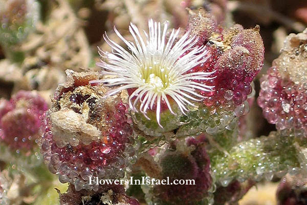 Mesembryanthemum crystallinumIce plant که به فارسی یخ در بهشت نامیده میشود، گیاهی از خانواده آزوآسه بومی جنوب آفریقا، جنوب اروپا می باشد. نیاز های این گیاه عبارتند از نور: زیاد رطوبت: کمی مرطوب درجه حرارت: حساس به سرما درجه سانتیگراد خاک: خاک شنی لومی با آبیاری مناسب