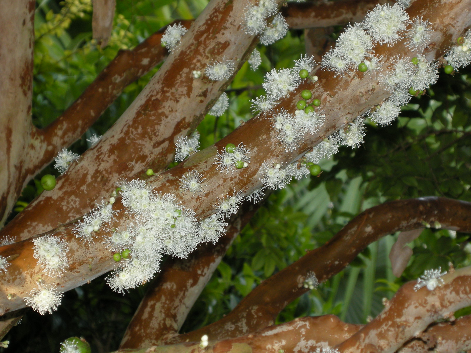 گل ها به رنگ سفید بوده که به صورت مستقیم روی تنه ی اصلی رشد می کنند. در نواحی غیر بومی ممکن است این درخت فقط یک یا دو بار در سال گل و میوه تولید کند اما در صورت فراهم نمودن شرایط مناسب و ایده آل برای رشد، گل ها و میوه های فراوان در طول سال تولید می شود.