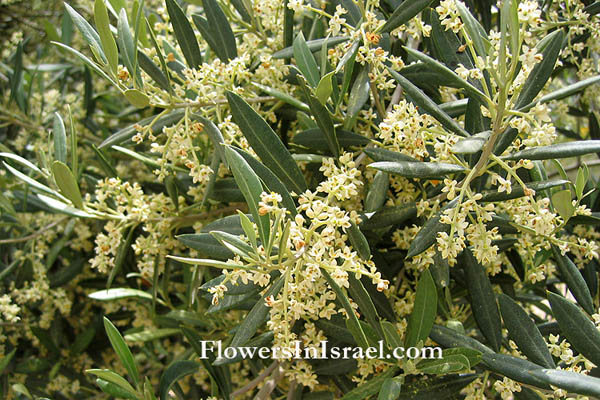 گل زیتون دارای چهار گلبرگ و دوپرچم است و گل آذین آن خوشهای است. جوانه گل روی شاخه همان سال ظاهر میشود ولی میوه زیتون روی شاخه سال قبل قرار دارد.