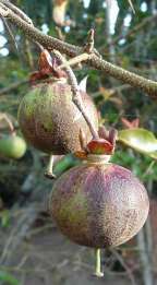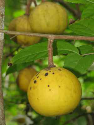 میوه ها حدود 60 میلیمتر قطر دارند. حاوی پوستی سخت، به رنگ قرمز-قهوه ای تیره، دارای بذوری برجسته در یک پالپ خشک، ترش و زرد رنگ هستند. این میوه ها در ماه های آپریل تا جولای روی درخت نمایان می شوند.