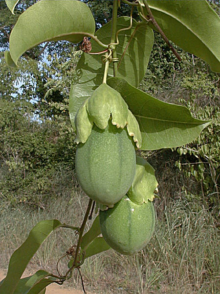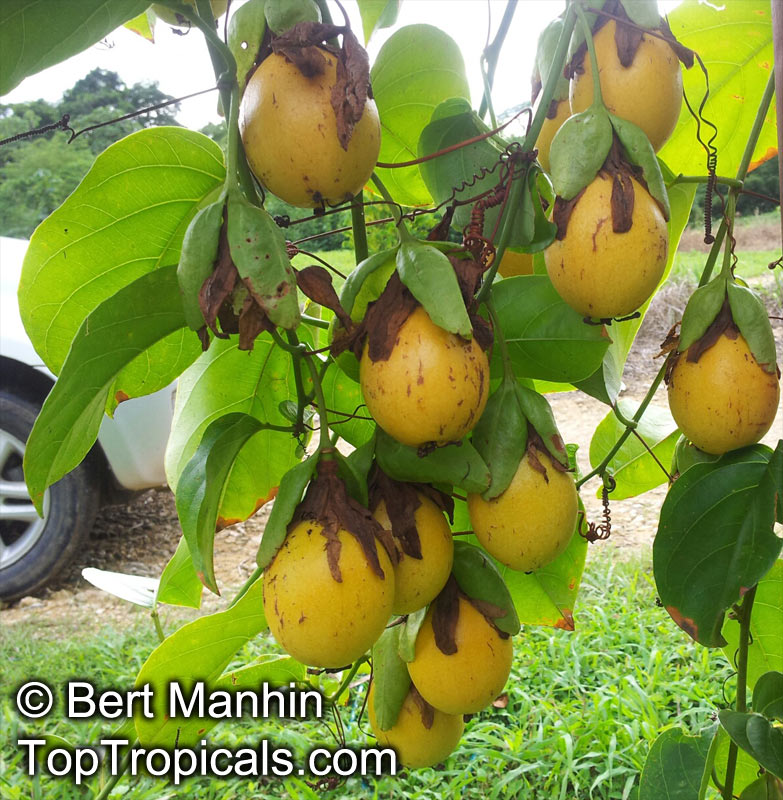 میوه ها بیضی شکل یا تخم مرغی شکل، به طول 5 تا 8 سانتیمتر و عرض 4 تا 6 سانتیمتر، به رنگ زرد مایل به نارنجی است. این میوه ها توسط سه براکته ی بزرگ، سبز رنگ و برگ مانند پوشیده شده اند. پوست میوه ها چرمی، به ضخامت 3 میلیمتر بوده که قسمت داخلی آن سفید رنگ و اسفنجی است که در صورت خشک شدن، سفت می شود. این میوه ها دارای پالپی مطبوع، آبدار، موسیلاژی و نیمه اسیدی است. هر میوه دارای تعدادی بذر می باشد. بذرها پهن و دارای شیارهای کوچکی است.