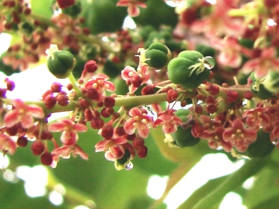 گلها می توانند نر ، ماده یا دوجنسی باشند. رنگ آنها صورتی بوده و کوچک هستند. گل آذین آن بصورت خوشه است. میوه ها بیشمار بوده و از زرد تا سبز هستند. سطح آنها واکسی است و آبدار و بسیار ترش نیز هستند.در هر میوه 4 تا 6 عدد بذر درون یک هسته سنگی قرار دارند. میوه دهی آن در آگوست تا سپتامبر است.