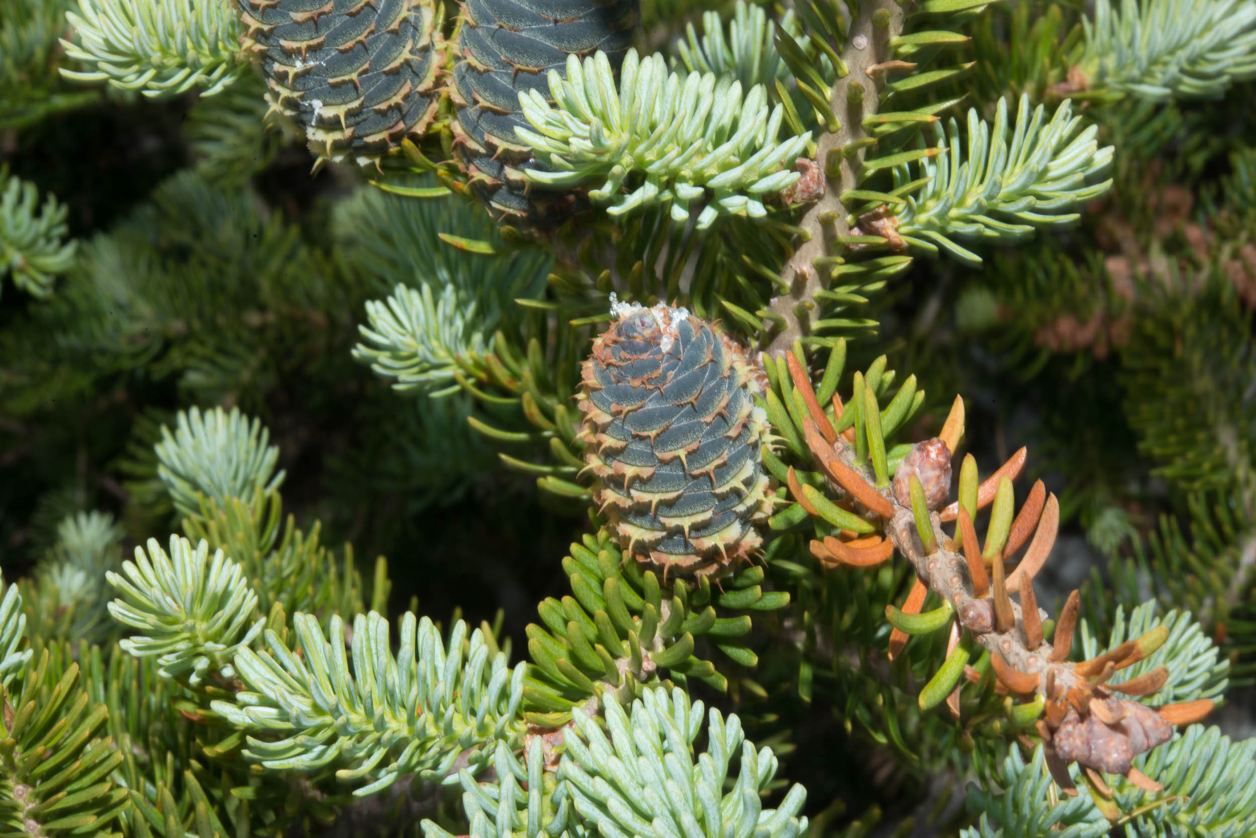 برگها سوزنی، چهارگوش و نسبتاً کوتاهاند و طول آنها معمولاً بین ۶ تا ۱۲ میلیمتر است. رنگ برگها سبز تیره با تهمایه آبی یا خاکستری است و سطح آنها دارای نوارهای روزنهای کمرنگ میباشد. سوزنها بهطور منفرد و به شکل شعاعی بر روی شاخهها قرار گرفتهاند. نوک برگها تیز و کمی سخت است، اما در مقایسه با برخی صنوبرهای دیگر کمتر خشن و آزاردهنده است.