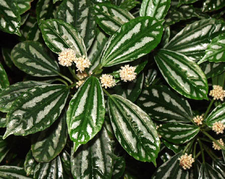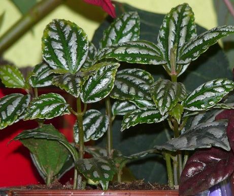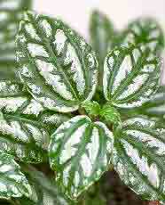 این گیاه برگهایی متوسط به رنگ سبز تیره و بیضی شکل دارد که هر برگ شامل نقوش نقره ای رنگی می باشد و علت نامگذاری این گیاه به Aluminium plant( گیاه آلومینیومی) نیز ،همین رنگ برگها است.