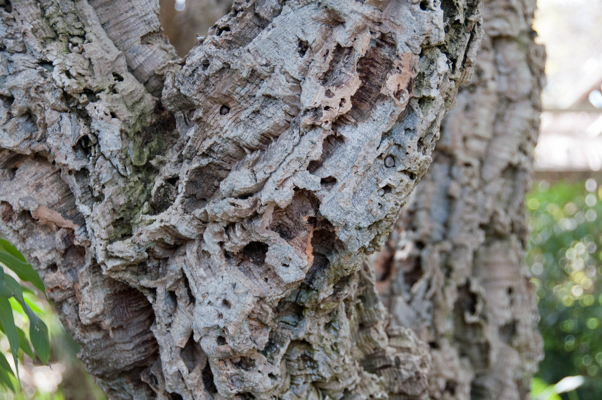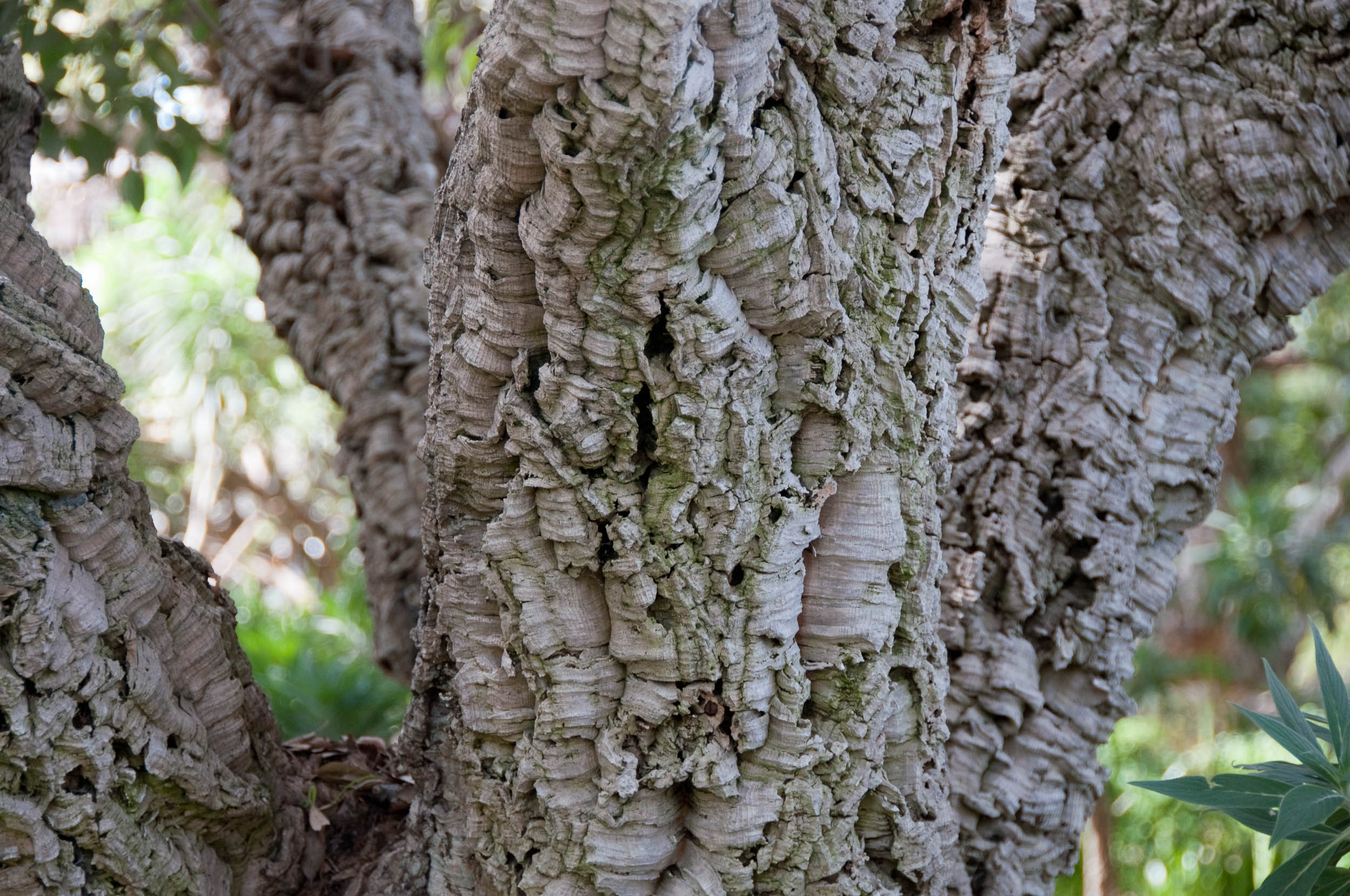 تنه قطور و استوانهای شکل است و با افزایش سن، قطری قابلتوجه مییابد. مهمترین ویژگی این گونه، لایه ضخیم چوبپنبهای (پریکارپ ثانویه) روی تنه و شاخههای اصلی است که سطحی ناهموار، ترکخورده و اسفنجی دارد. رنگ پوست خارجی از قهوهای خاکی تا خاکستری تیره متغیر است، در حالیکه لایه داخلی چوبپنبه پس از جدا شدن، زرد مایل به قهوهای دیده میشود. چوب داخلی سخت، قهوهای و نسبتاً سنگین است و رگههای حلقههای سالیانه بهروشنی قابل مشاهدهاند.