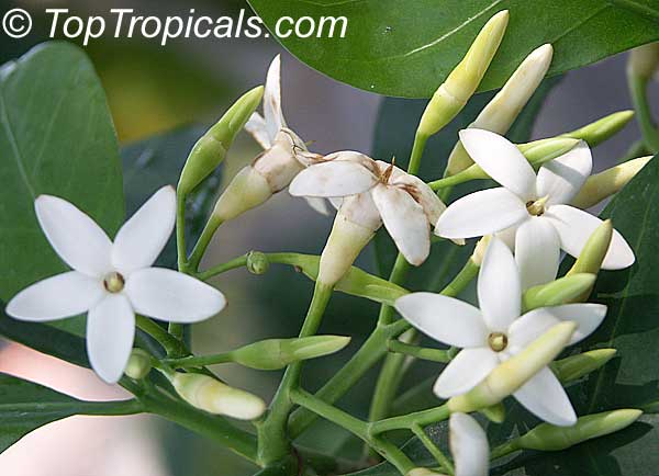 گل ها معطر، به رنگ سفید، دارای پنج گلبرگ کشیده و مدور هستند. این گل ها در ماه های سپتامبر تا نوامبر ظاهر می شوند. عطر گل ها مشابه عطر گل های یاس معمولی است. گل ها در هنگام عصر شکوفا می شوند.