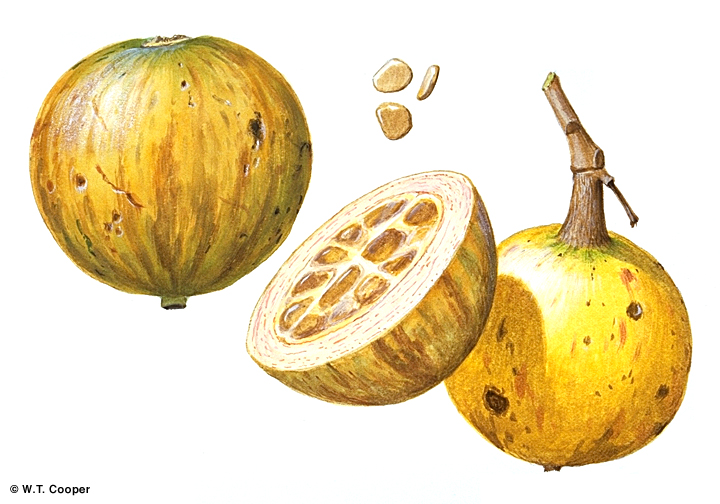 میوه گرد یا تخم مرغی شکل بوده و حدود 3 تا 4 سانتیمتر قطر دارد. این میوه ها طی ماه های آوریل تا ژوئن می رسند. میوه ها را می توان به صورت خام نیز مصرف نمود.