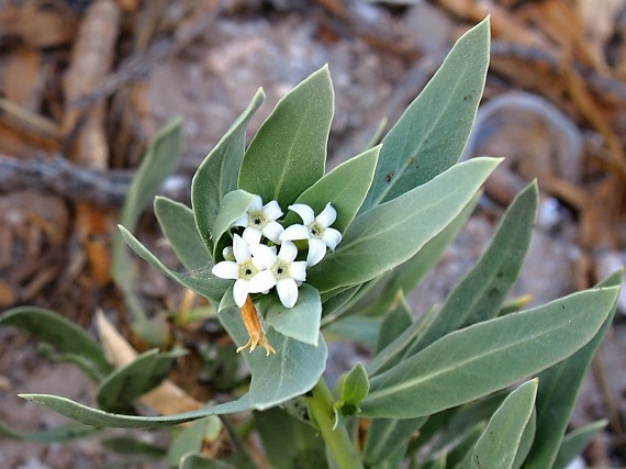 برگ های این گیاه به صورت خطی – نیزه ای یا بیضوی، با آرایش مارپیچی، بدون دمبرگ، با حاشیه ای یکپارچه، در دو انتها به صورت باریک، به طول 7.5 تا 10 سانتیمتر و عرض یک تا دو سانتیمتر، بدون کرک یا دارای کرک در بخش وسط یا رگبرگ میانی است. برگ ها در صورت خشک شدن، ضخیم و زرد رنگ می شوند.