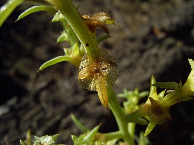 گل ها دوجنسی هستند یعنی دارای اندام نر و ماده می باشند. ساقه مرکزی گیاه حالت قائم ولی انشعابات و شاخه‌های آن حالت افتاده یا خمیده دارند ناحیه راس برگها و براکترهای گیاه خاردار است.