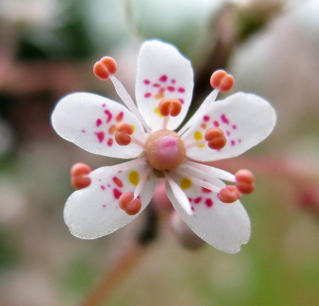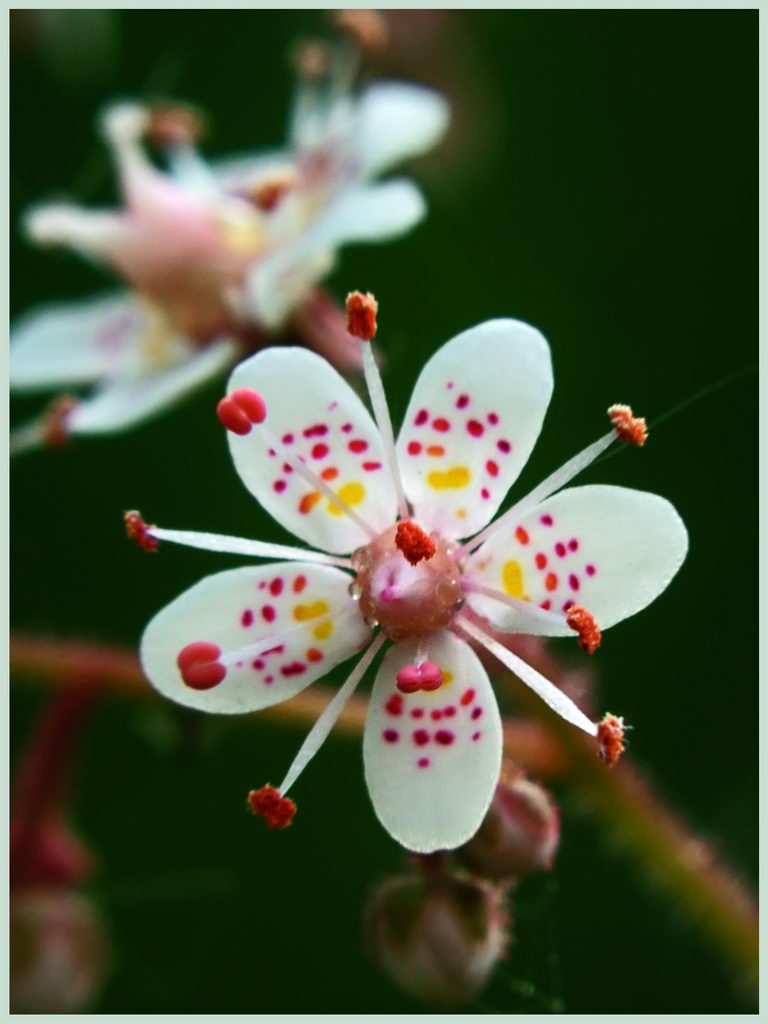گلها روی ساقههای باریک و قائم قرار میگیرند و در انتها به صورت خوشه یا پانیکول سبک و منشعب ظاهر میشوند. رنگ گلها غالباً سفید تا سفید-صورتی است و گلبرگها کوچک و ستارهای شکلاند. روی گلبرگها معمولاً نقطهگذاریهای ظریف صورتی یا قرمز دیده میشود. تضاد میان ساقههای گلدهنده بلند و روزتهای کوتاه برگ، سیمای شاخص این گیاه را میسازد.