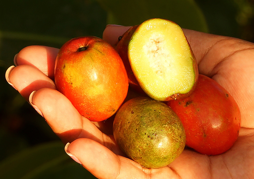 میوه ها آلویی شکل بوده و در دسته های 2 تا 3 تایی ظاهر می شوند. این میوه ها به رنگ ارغوانی، قرمز روشن یا قرمز تیره، نارنجی، زرد یا زرد و قرمز دیده می شوند. طول میوه ها از 2.5 تا 5 سانتیمتر متفاوت است و در شکل های متنوعی مانند تخم مرغی، دوکی، واژتخم مرغی یا گلابی شکل دیده می شوند. در انتهای هر میوه نیز یک برآدمدگی یا دندانه دیده می شوند. پوست میوه ها براق و محکم است. این میوه ها دارای گوشتی معطر، به رنگ زرد، فیبری، بسیار آبدار، اسیدی یا نیمه اسیدی، در برخی موارد دارای مقدار جزیی تربانتین است.