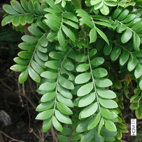 برگ ها خزاندار، با آرایش متناوب، مرکب، به طول 12 تا 25 سانتیمتر (در برگ های بالغ) هستند. برگ های جوان این گیاه به رنگ قرمز یا ارغوانی دیده می شوند. هر برگ دارای حدود 5 تا 19 برگچه ی واژتخم مرغی تا نیزه ای یا بیضوی-کشیده، به طول 2 تا 4 سانتیمتر و تقریباً بدون دمبرگ می باشد.