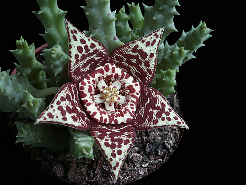 کاکتوس گل ستاره دریایی بوته ای جالب شبیه کاکتوس و گل آن 5 پر و مانند ستاره دریایی است.این گل از طیف گسترده ای از رنگ های حنایی مایل به گوگردی و زرد رنگ با سایه مسی قرمز متمایل به ارغوانی با خطوط سیاه و سفید کاملاً مشخص می باشد و درخشش زیبایی در تاریکی دارد.