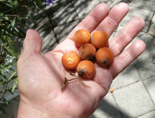میوه ها به رنگ زرد مایل به سبز، بیضی شکل، دارای سطحی صاف، به طول 4 تا 5.5 سانتیمتر، دارای مزوکارپ (میانبر) ضخیم، گوشتی و فیبری است.