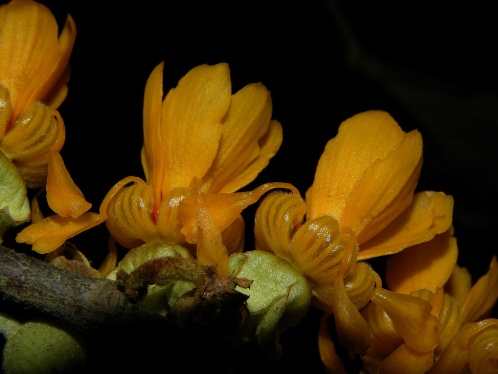 گل ها به صورت خوشه ای، منفرد یا دوتایی در حاشیه برگ ها تشکیل می شوند. این گل ها دارای گبرگ هایی به رنگ زرد با پایه ای قرمز رنگ می باشند.