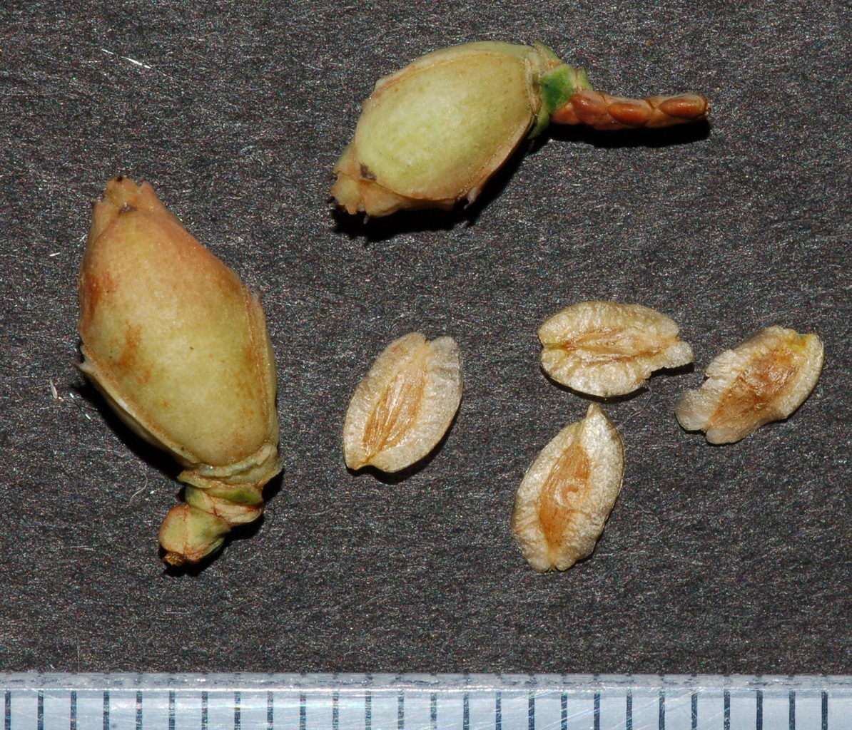 برگ ها کوچک و دارای یک غده صمغی کوچک در پشت برگ و به رنگ سبز تیره. گل اهمیت زینتی ندارد و در نوک شاخه ها به تنهایی قرار گرفته است. میوه ان به شکل مخروط نازک کوچکی است به رنگ قهوه ای مایل به زرد
