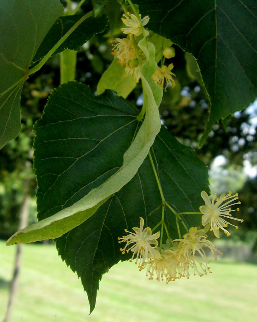 گل ها کوچک، به رنگ زرد مایل به سبز و هرمافرودیت هستند که در خوشه های پنج تا یازده تایی در اوایل تابستان تشکیل می شوند. همچنین دارای براکته های برگ مانندی به رنگ زرد مایل به سبز می باشند. این گل ها دارای عطر و بوی بسیار قوی هستند به طوری که این درختان را برای جلب توجه زنبورهای عسل بسیار مناسب کرده است.