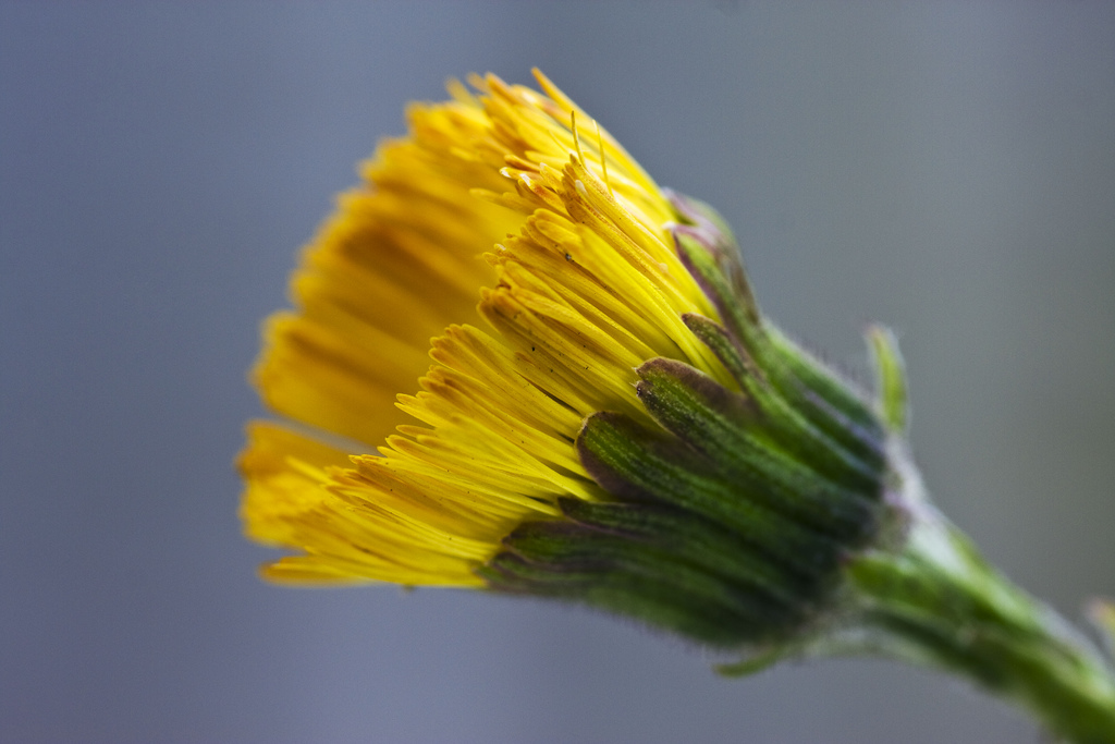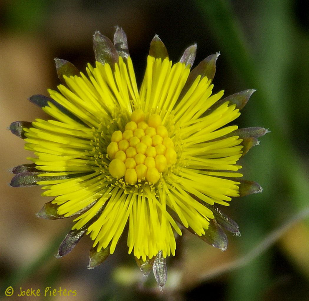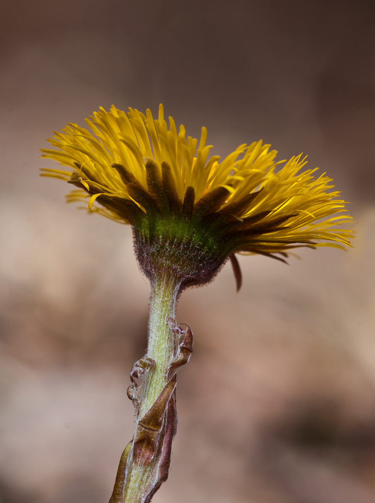 گیاهی چند ساله و ریزو م دار است گل و جوانه ان روی ریزوم رشد می کنند.در اوایال بهار ساقه های پشمالو راست و بدون انشعاب که با فلس های قهوه ای مایل به قرمز پوشیده شده است که از جوانه گل رشد می کند و گل زرد رنگ که از بیش از 300 گلچه شعاعی شکل و بیش از 40 گلچه لوله ای شکل تشکیل شده است .