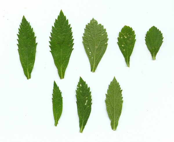 برگ ها متقابل هستند. گل آذین استوانه ای شکل است و گل ها کوچک هستند. رنگ گلها تقریباً بنفش می باشد.