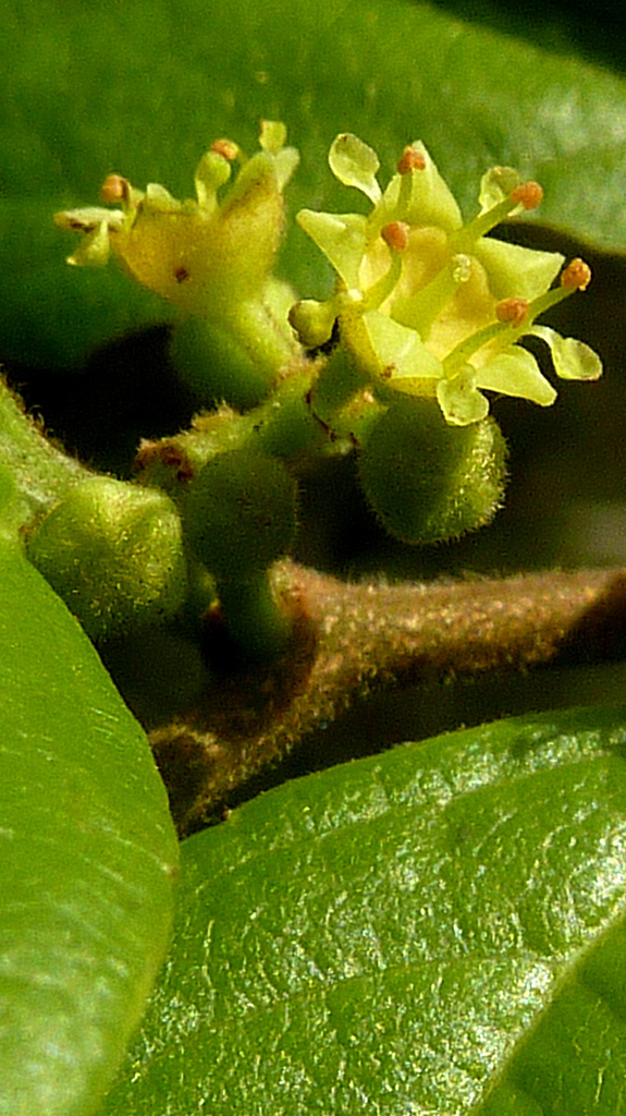 جوآ برگ هایی مومی، گل هایی کوچک و زرد رنگ و میوه هایی گرد، کوچک، زرد رنگ و خوراکی تولید می کند. این میوه ها حدود 3 تا 4 سانتیمتر قطر داشته و به دلیل طعم مطبوع، مورد علاقه ی برخی از پرندگان می باشند. میوه ها شیرین بوده و دارای پالپی سفید رنگ هستند.