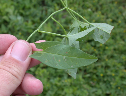 برگ های آن متناوب ، کشیده و بلند، عموماً سرنیزه ای شکل و نوک تیزند و دارای دمبرگی کوتاه می باشند. رگبرگ های پنجه ای آن از قاعده برگ آغاز شده و در انتهای برگ بصورت متقابل روبروی هم قرار می گیرند. برگ های پیچک در قاعده دارای لوب های پهن می باشند؛ البته شکل برگ بسته به شرایط محیط رشد، از تخم مرغی و مستطیلی تا باریک و تیز می تواند متفاوت باشد. سرنیزه ای بودن برگ ها در شرایط تنش خشکی بیشتر قابل مشاهده است.