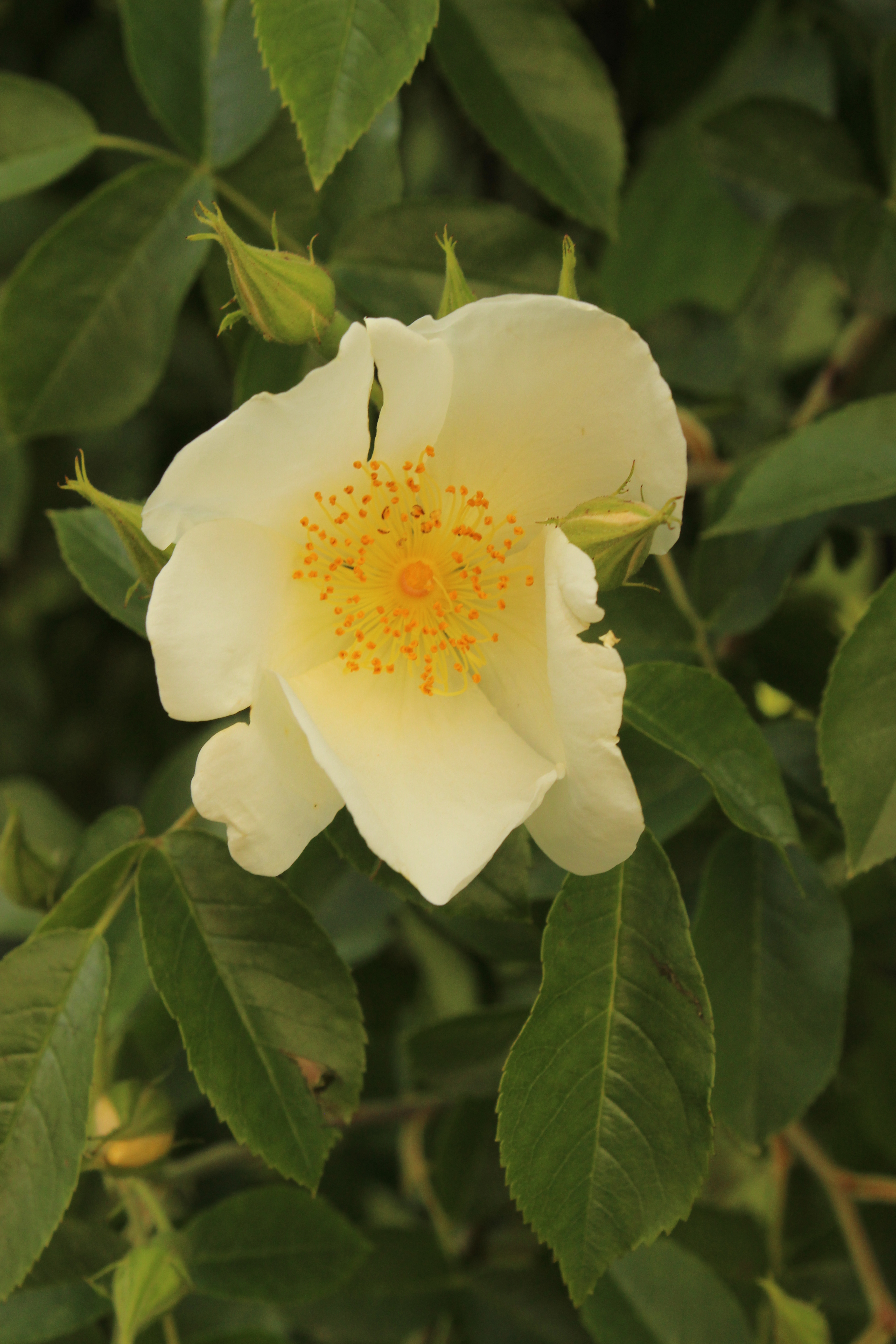 روی ساقه خارهای صاف یا کمی خمیده وجود دارد. برگ ها به رنگ سبز روشن یا سبز مایل به خاکستری و به صورت مرکب دیده می شوند. هر برگ دارای 5 تا 7 برگچه تخم مرغی شکل می باشد. برگچه ها به صورت دندانه دار و دارای دندانه های کوچکی هستند. در برخی موارد در محل رگبرگ ها کرک وجود دارد. میوه ها کوچک و تخم مرغی شکل بوده و مانند میوه های سایر گونه های رز به آنها "هیپ" گفته می شود. این میوه ها به رنگ قرمز-نارنجی بوده و در پاییز ظاهر می رسند. هر میوه بیش از 15 میلیمتر قطر دارد اما دارای یک لایه نازکی از گوشت و تعداد زیادی بذر می باشد.